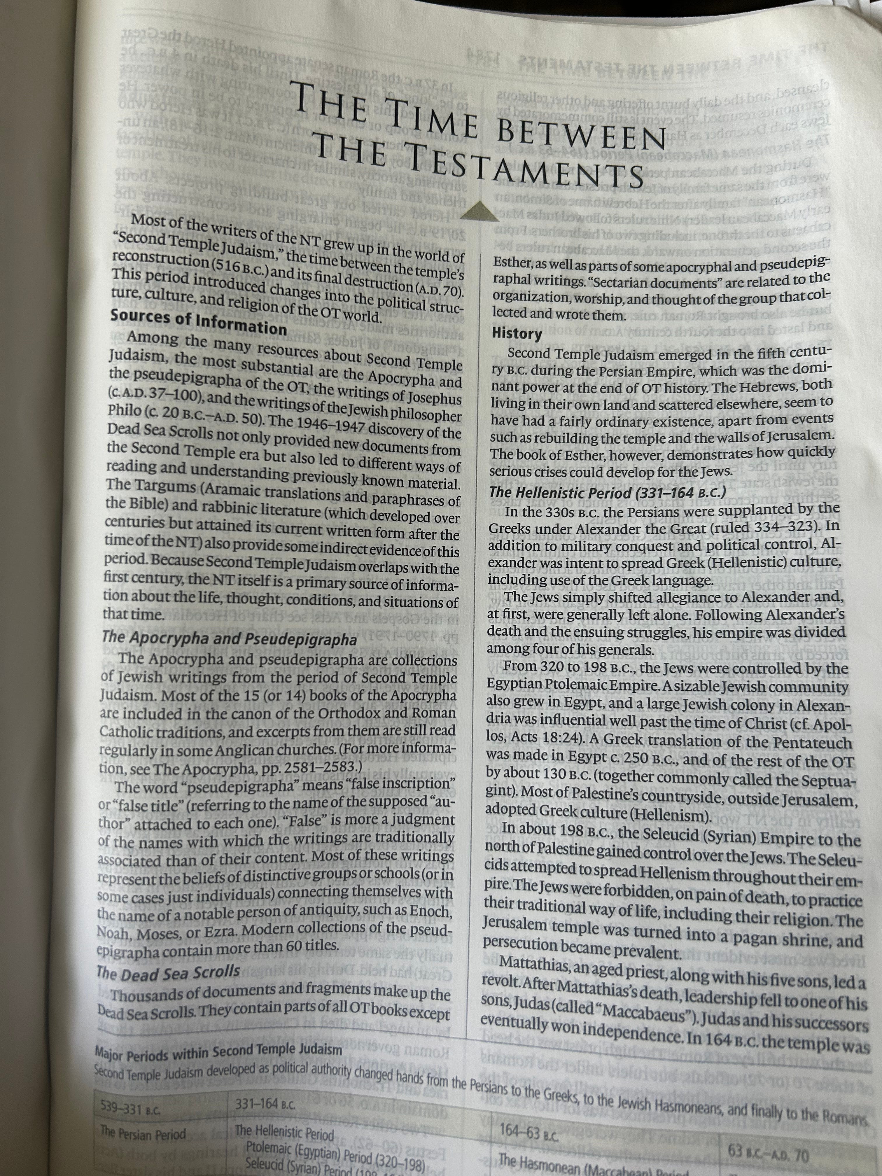There’s a ten-page section in my Bible that lays out the history of the time between the Testaments. The amount of history provided is staggering. What was God up to during this time? What’s with the silence?